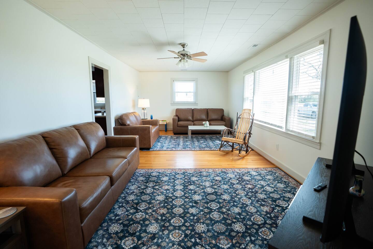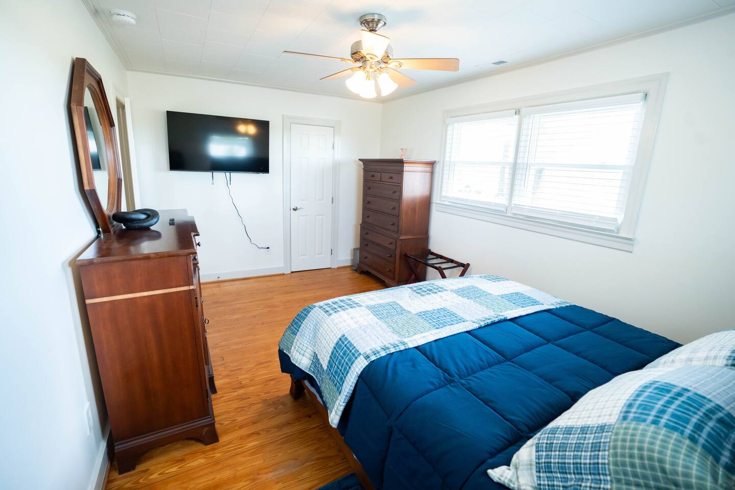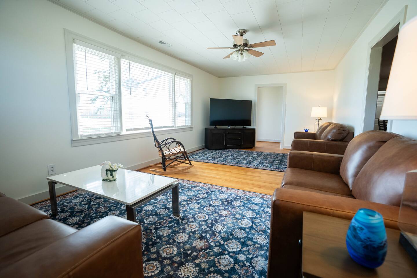 Wake up to wide-open farmland, working tractors, and real country quiet. This fully renovated 1950s ranch sits deep on 350 acres of active farm land—private, peaceful, and built solid. Once my grandpa’s home, it’s now a full-time short-term rental designed for families, travelers, and wedding guests. The Farm • Secluded on 350 acres with 3 ponds • Active working farm—watch tractors, irrigation & harvest • Long ¼-mile driveway = zero road noise • Fresh local well water • Turkey, NC—near Powell Comeback Farms • Piggly Wiggly 6 mi | Raleigh ~1 hr | Wilmington ~70 min The House (Single-Level Ranch) • Built in the 1950s, recently renovated & sturdy • 3 Bedrooms / 2 Full Baths • Master: King bed • Bedroom 1: Custom queen-over-queen wood bunk (very sturdy) • Bedroom 2: Custom queen-over-queen wood bunk (very sturdy) Living & Comfort • Living room with 2 leather couches + leather loveseat • Smart TV + fast fiber internet • Full-size washer & dryer Kitchen & Baths • Brand-new stainless steel appliances • Fully stocked kitchen • Bathroom 1: Tub + shower • Bathroom 2: Walk-in shower Book a real country escape—quiet, spacious, and built to last.